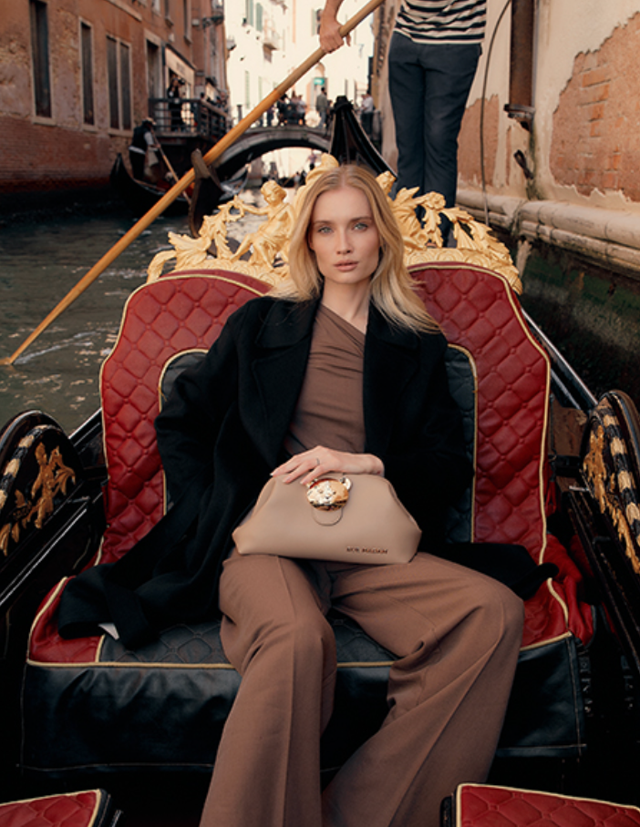 Pouch in ecopelle liscia con chiusura magnetica con orsetto e logo metallico. Catenella removibile e fodera interna in cotone con tasca. L 30 H 16 P 14