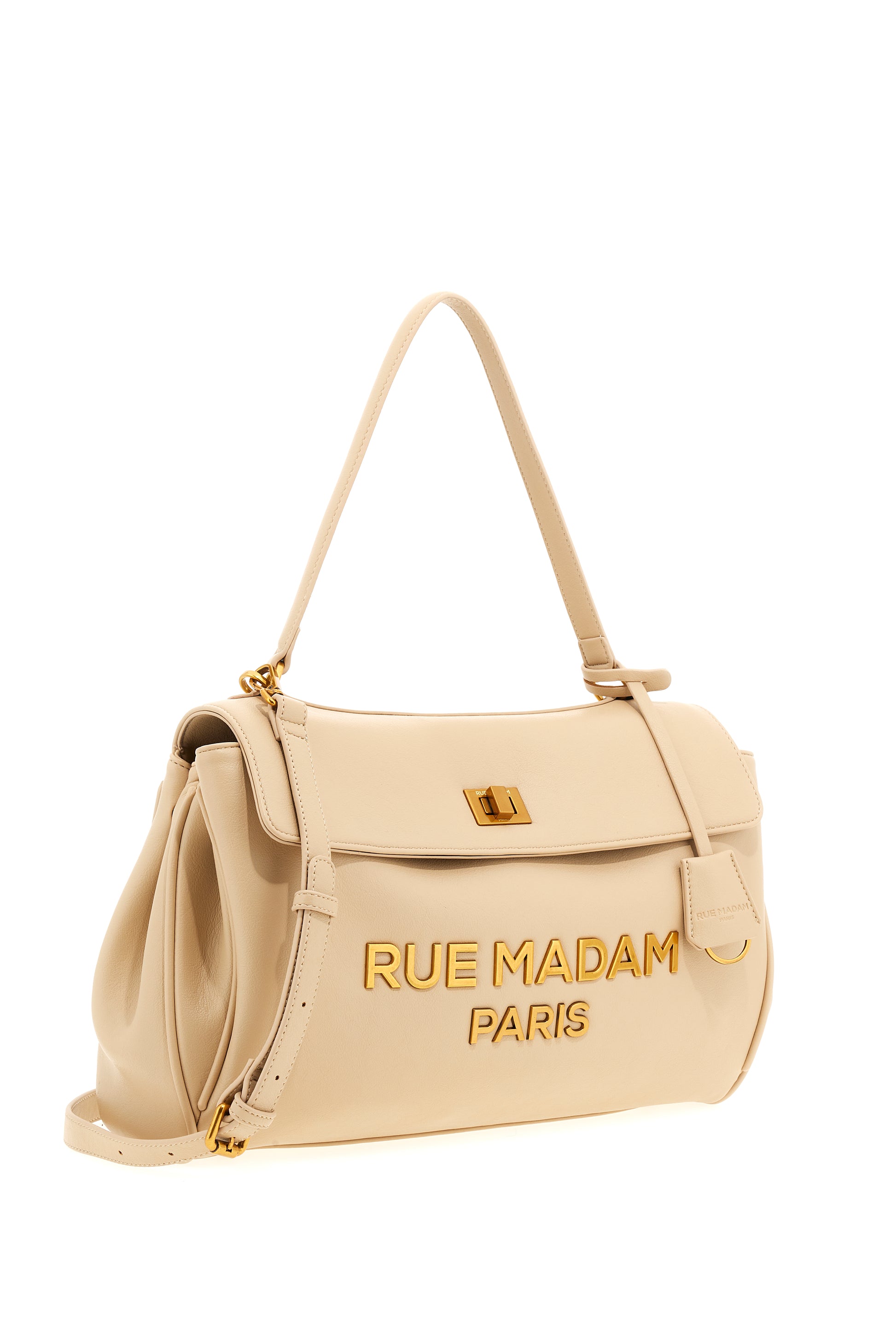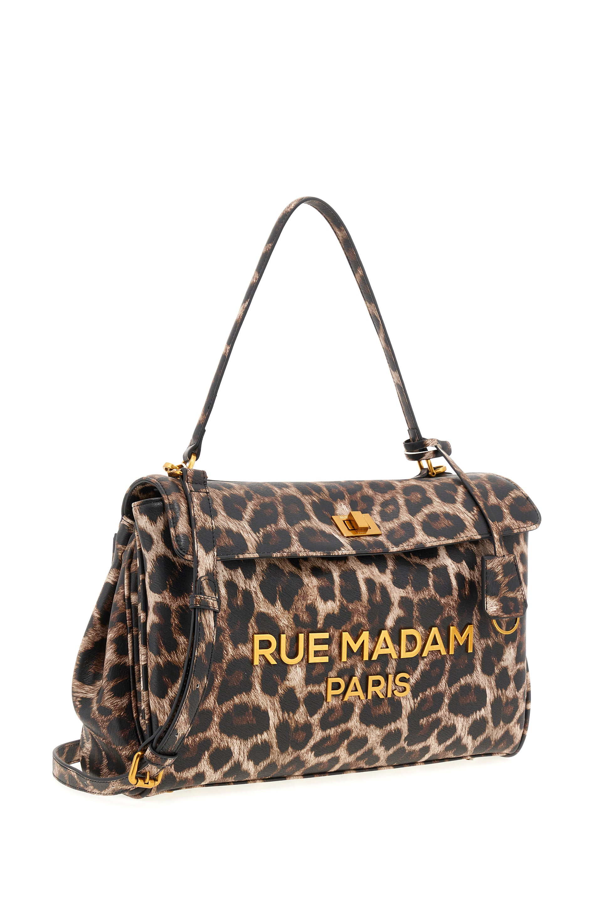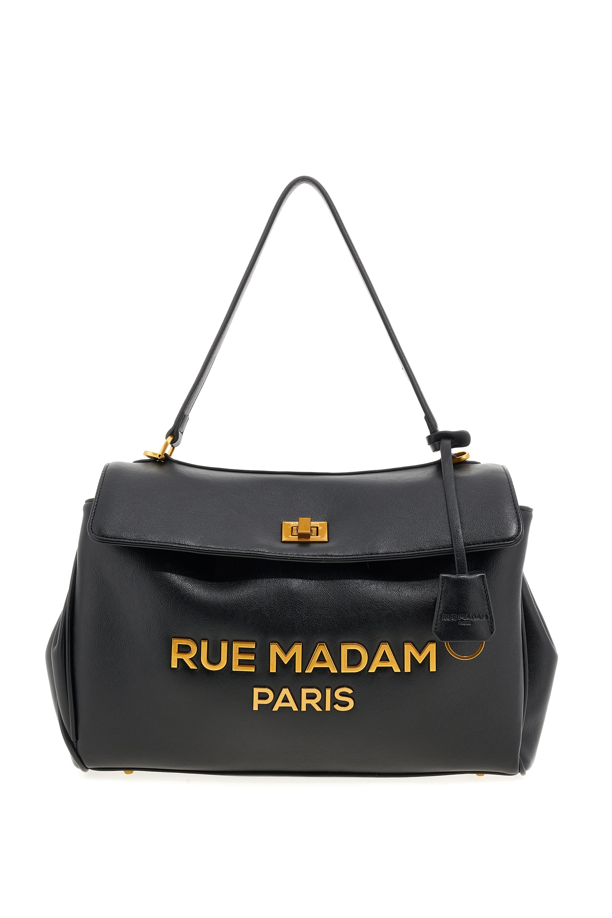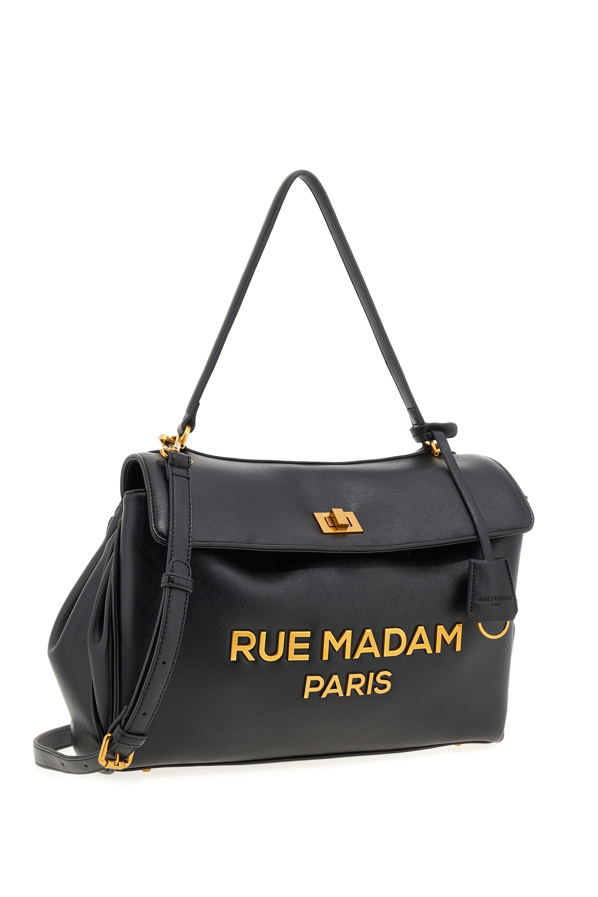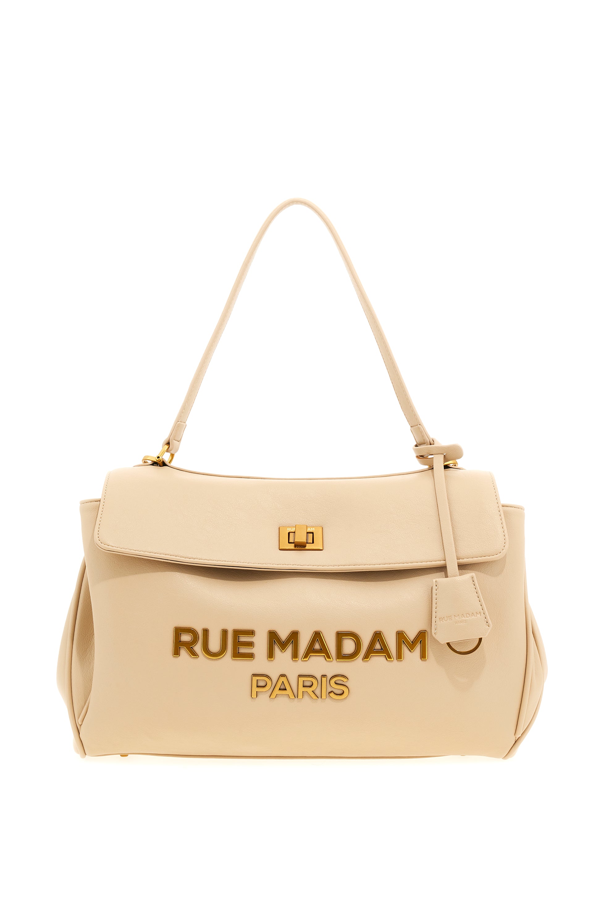 Borsa a spalla versione grande in ecopelle liscia con logo in metallo effetto invecchiato e chiusura a girello. Portachiavi e tracolla removibile e fodera interna in cotone con tasca. L 36 H 25 P 12