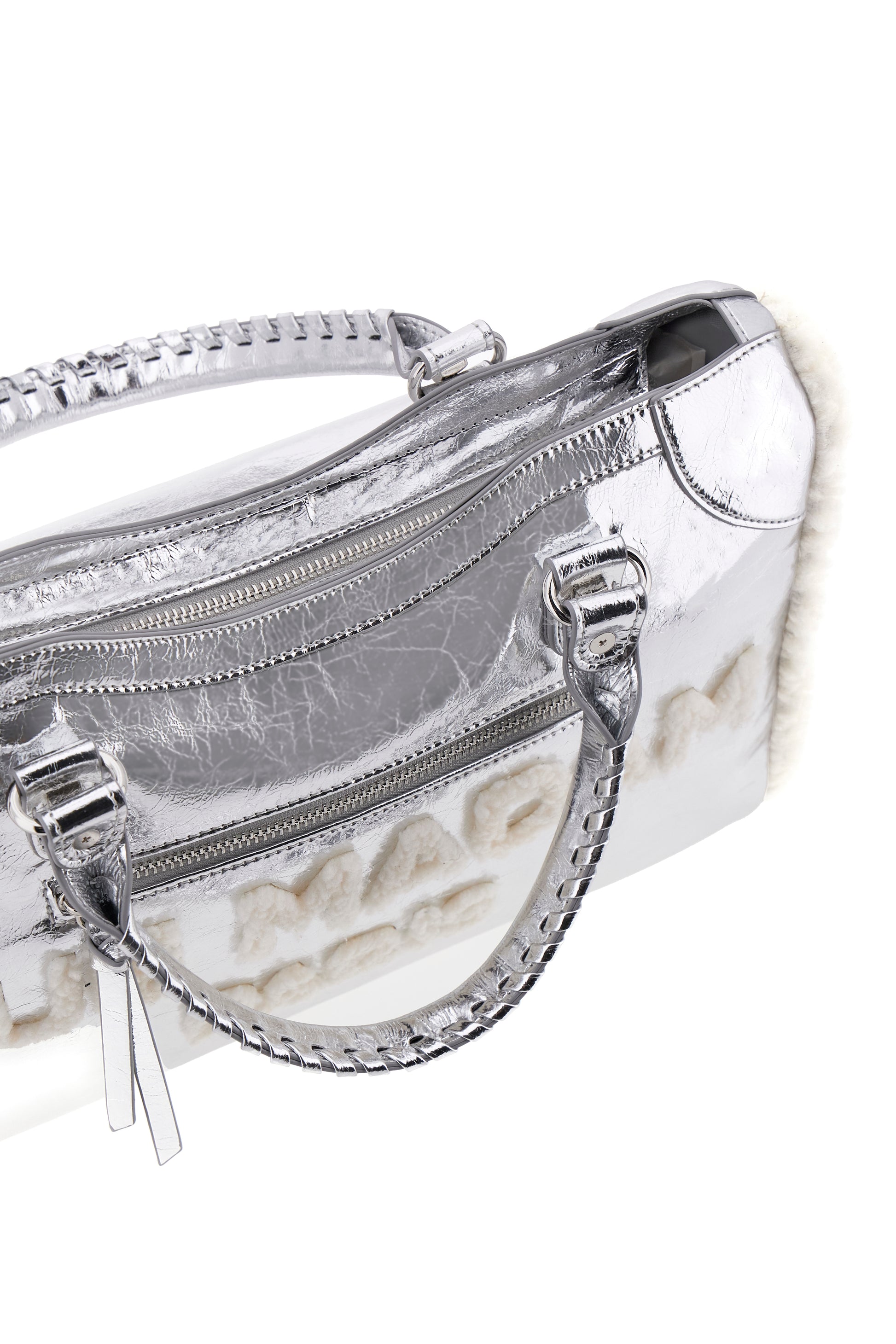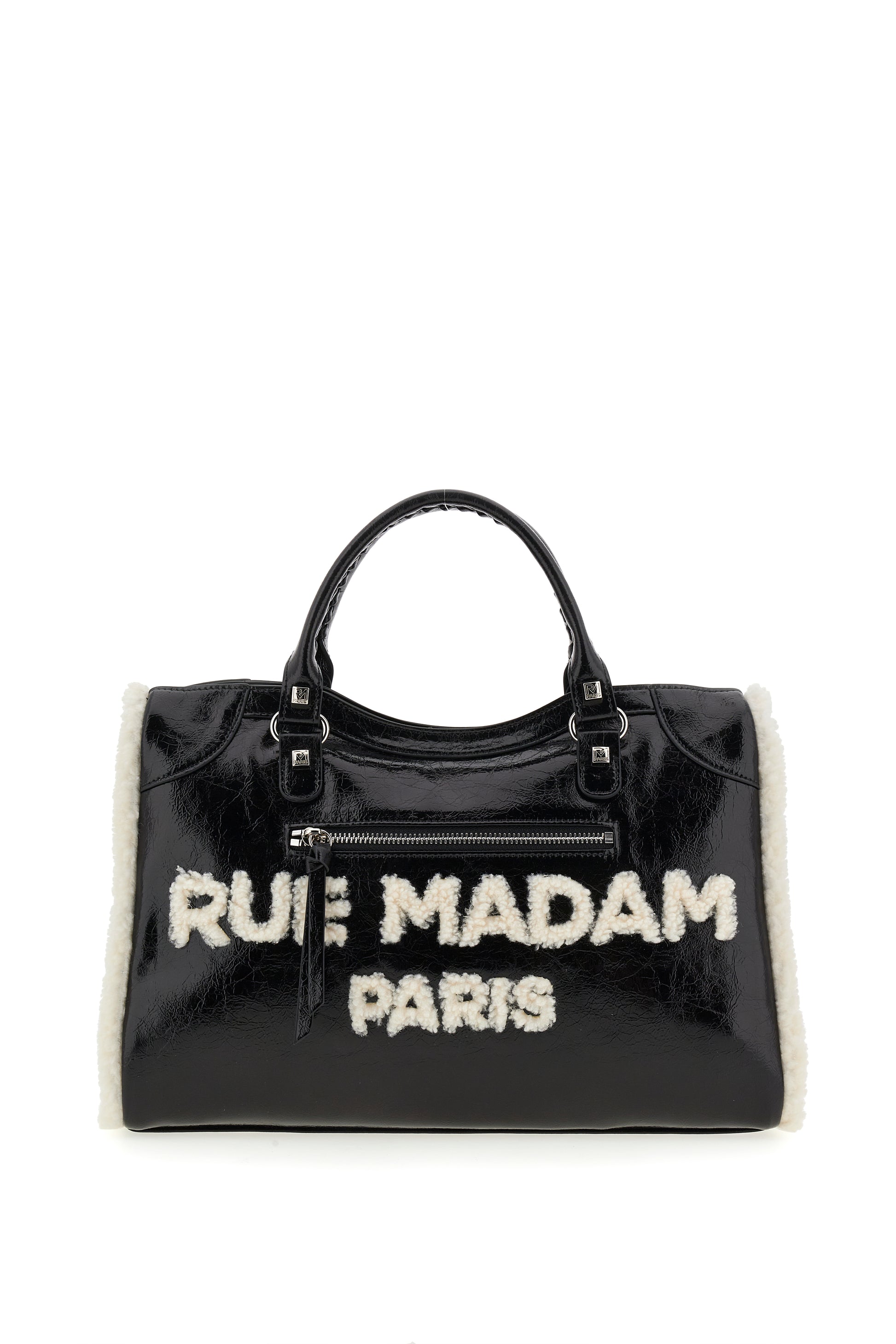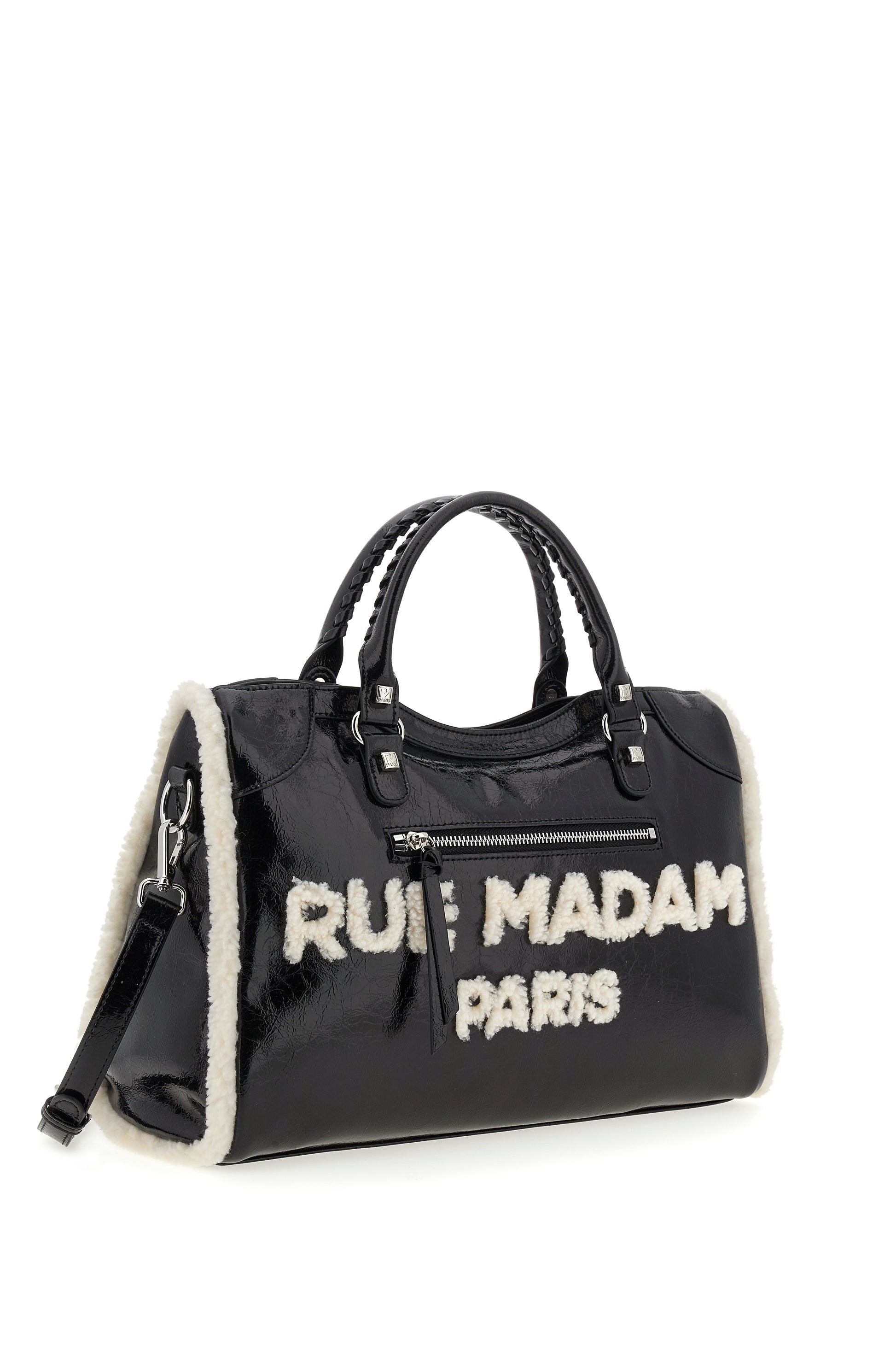 Tote Bag in ecopelle laminata con logo e profili in eco-montone. Tracolla removibile e fodera interna in cotone con tasca. L 38,5 H 25 P 16