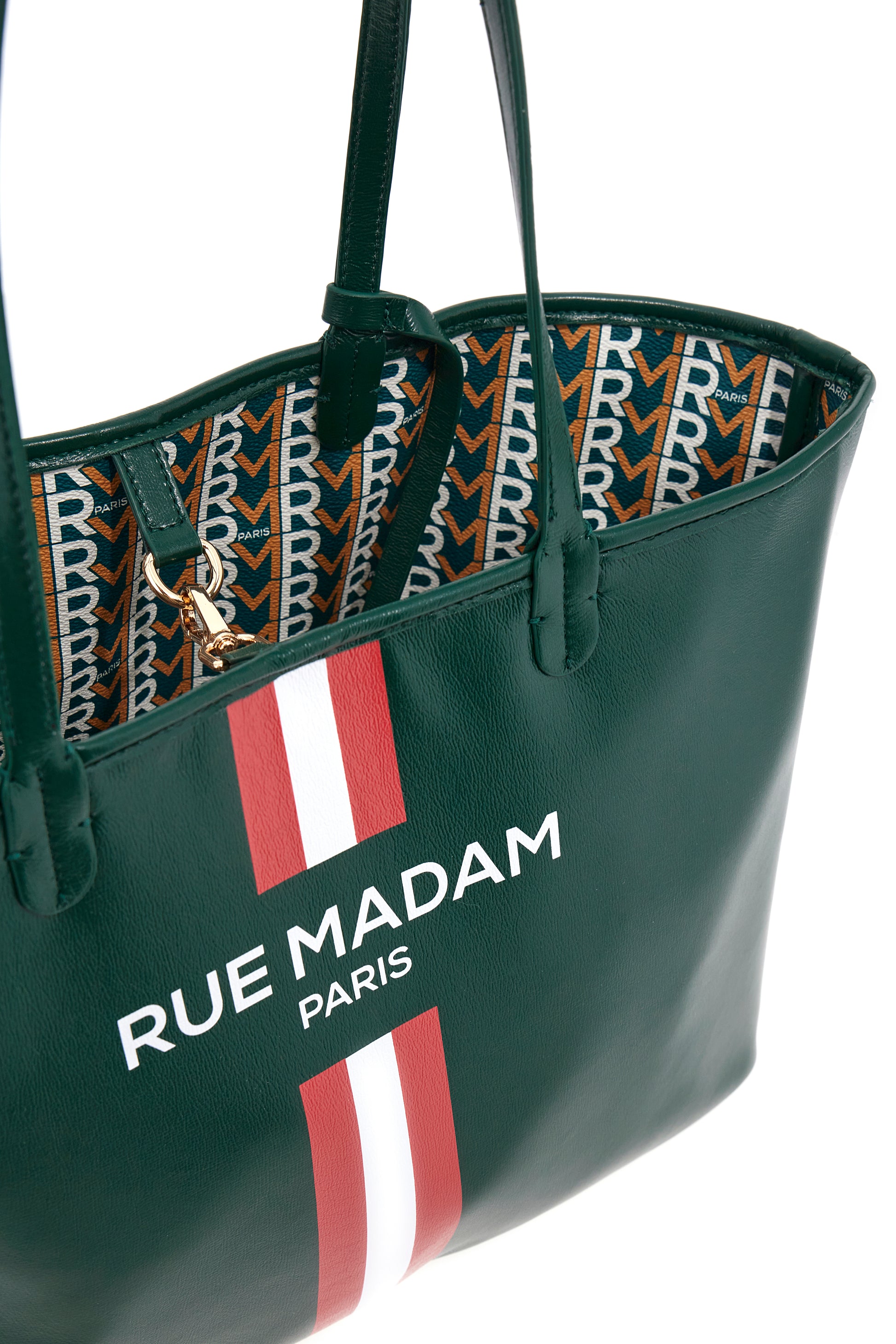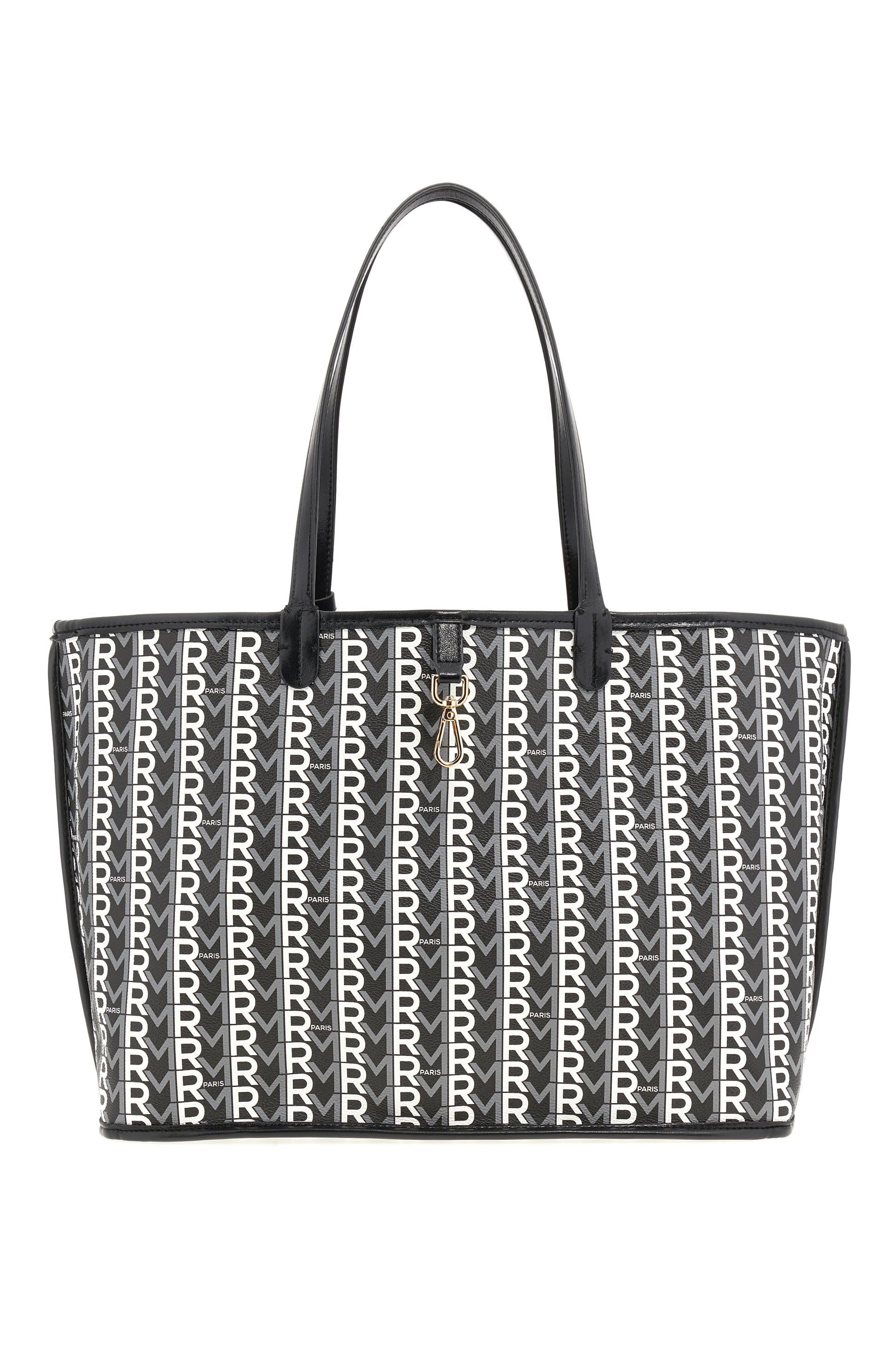 Shopping bag reversibile in morbida ecopelle con stampa tricolore e l'iconico pattern monogram RM. Chiusura con gancetti e pochette removibile. L 49 H 28 P 15