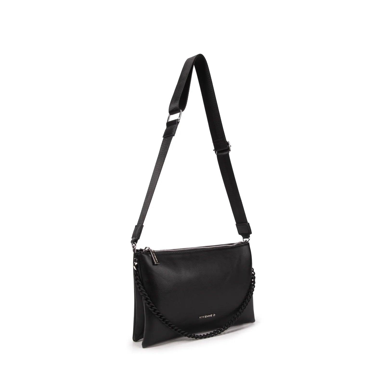Pochette doppia in ecopelle liscia, con due tasche interne di cui una con zip, logo VIVIENNE D finitura argentata